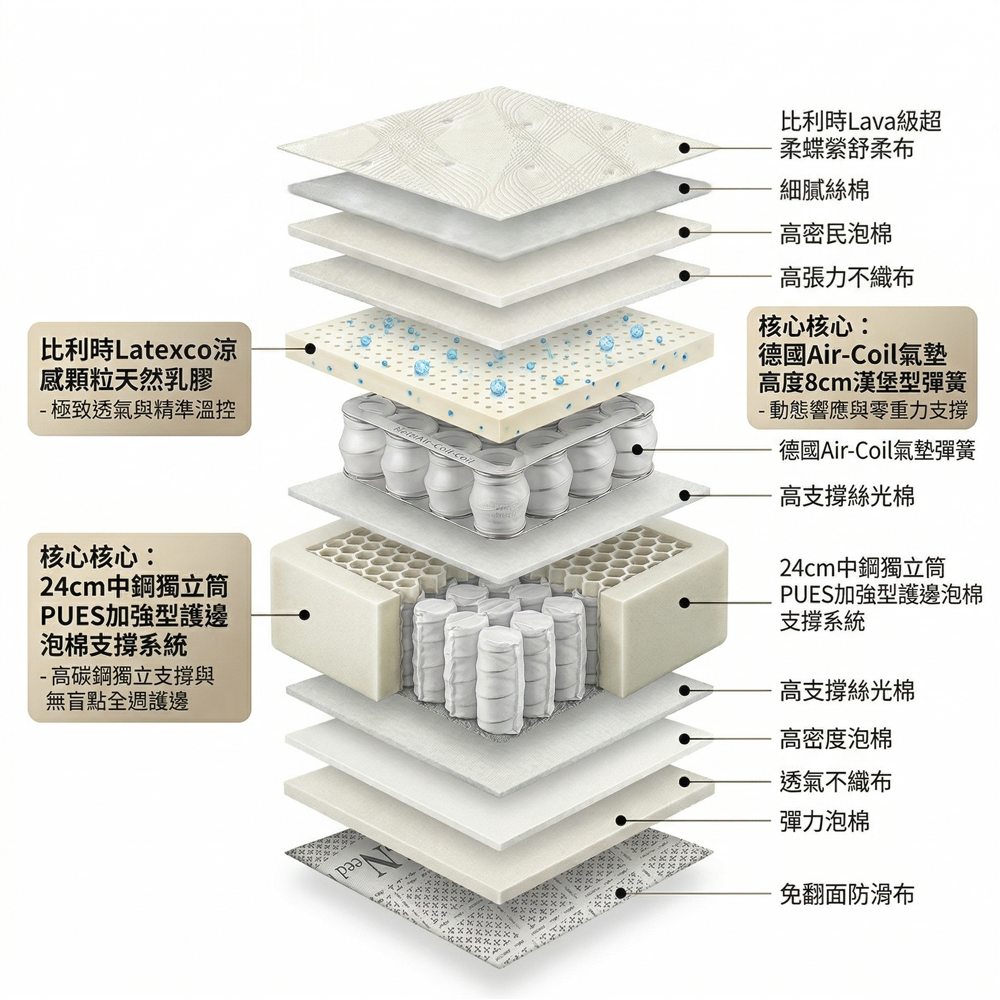 透過分層、分區的精密設計,它能全方位地適應不同體型和睡眠習慣,從而真正實現高品質的睡眠與全方位的健康維護。